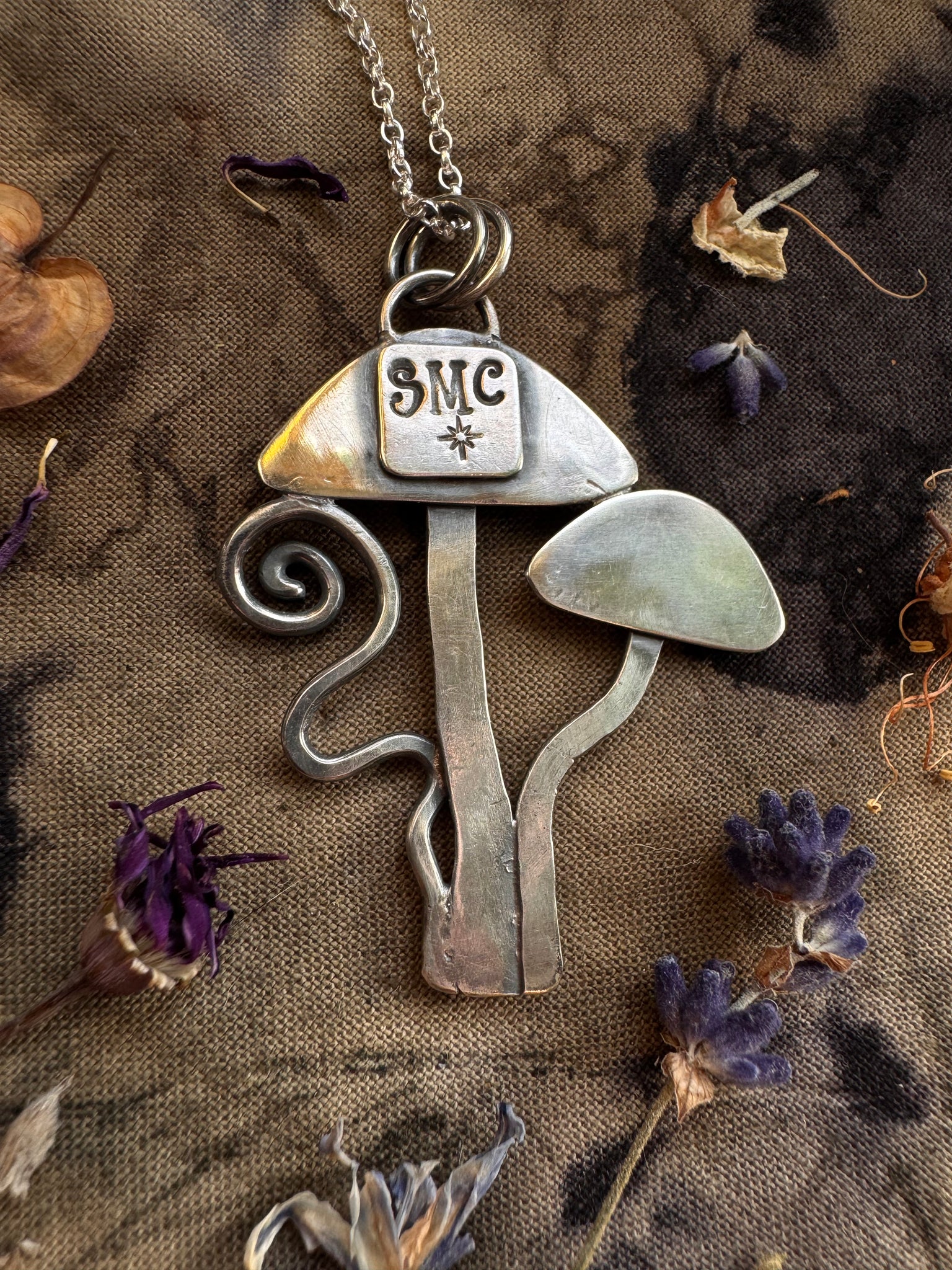 A whimsical sterling silver mushroom necklace featuring two hand-forged fungi with textured caps, a tiny crescent-moon detail, and swirling organic stems—earthy, enchanting, and full of woodland magic. This pendant is cut out free hand making it one of a kind.