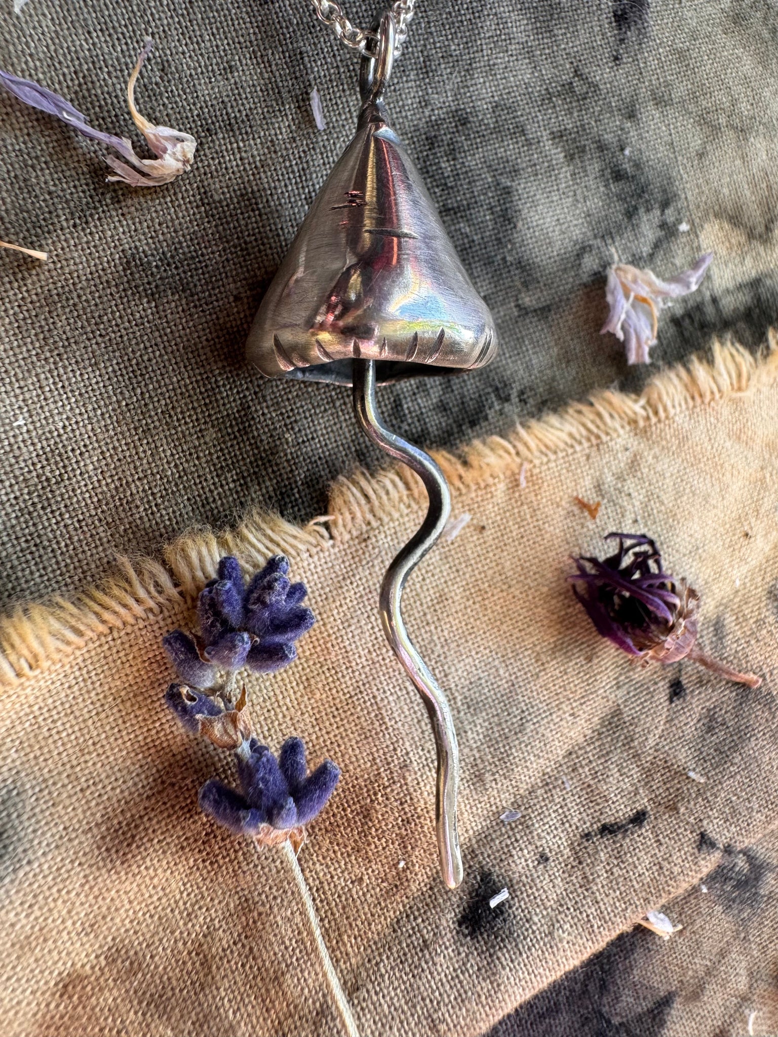 A handcrafted sterling silver mushroom necklace featuring a single sculpted cap and a beautifully winding stem. Its organic curves and subtle texturing give it a whimsical, woodland charm—an enchanting little piece of wearable art inspired by nature’s magic. The mushroom measures 6cm from top to bottom.