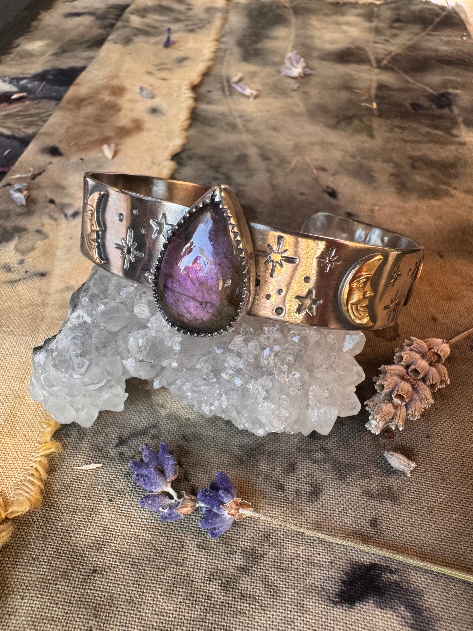 A celestial cuff forged from starlit silver, adorned with brass moons that rise and set across its surface. At its heart glows an ethereal labradorite, which catches the light beautifully. This piece feels like a whispered spell—an orbit of mystery, lunar energy, and quiet enchantment.