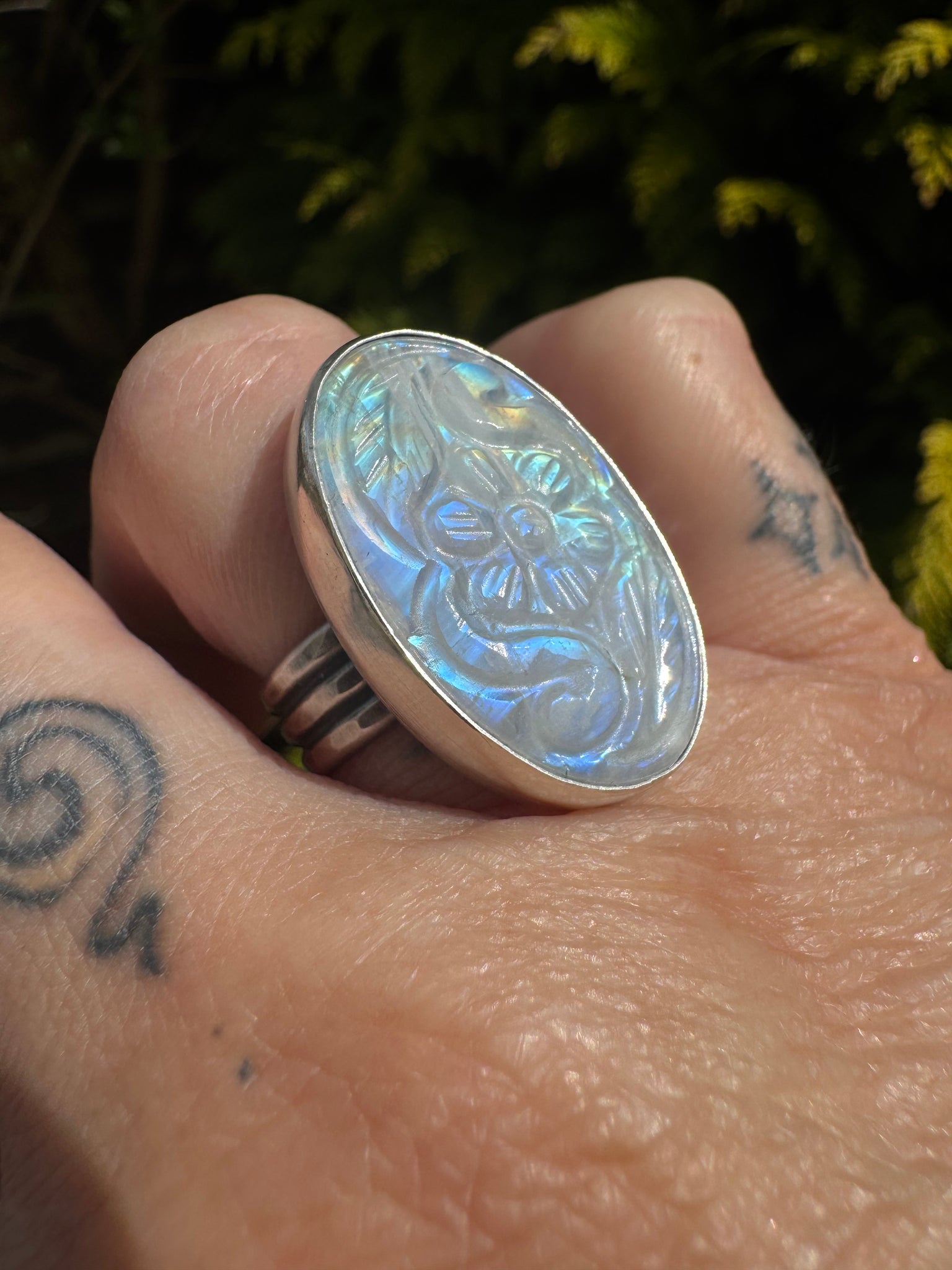 Carved flower Rainbow moonstone ring